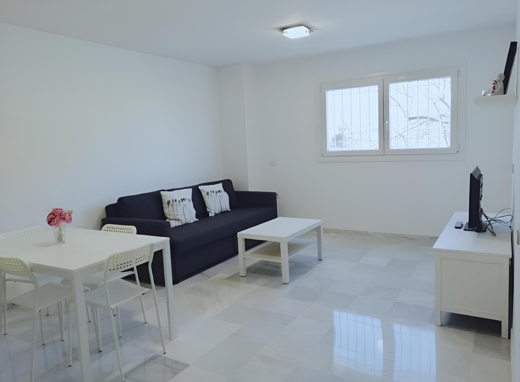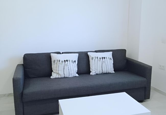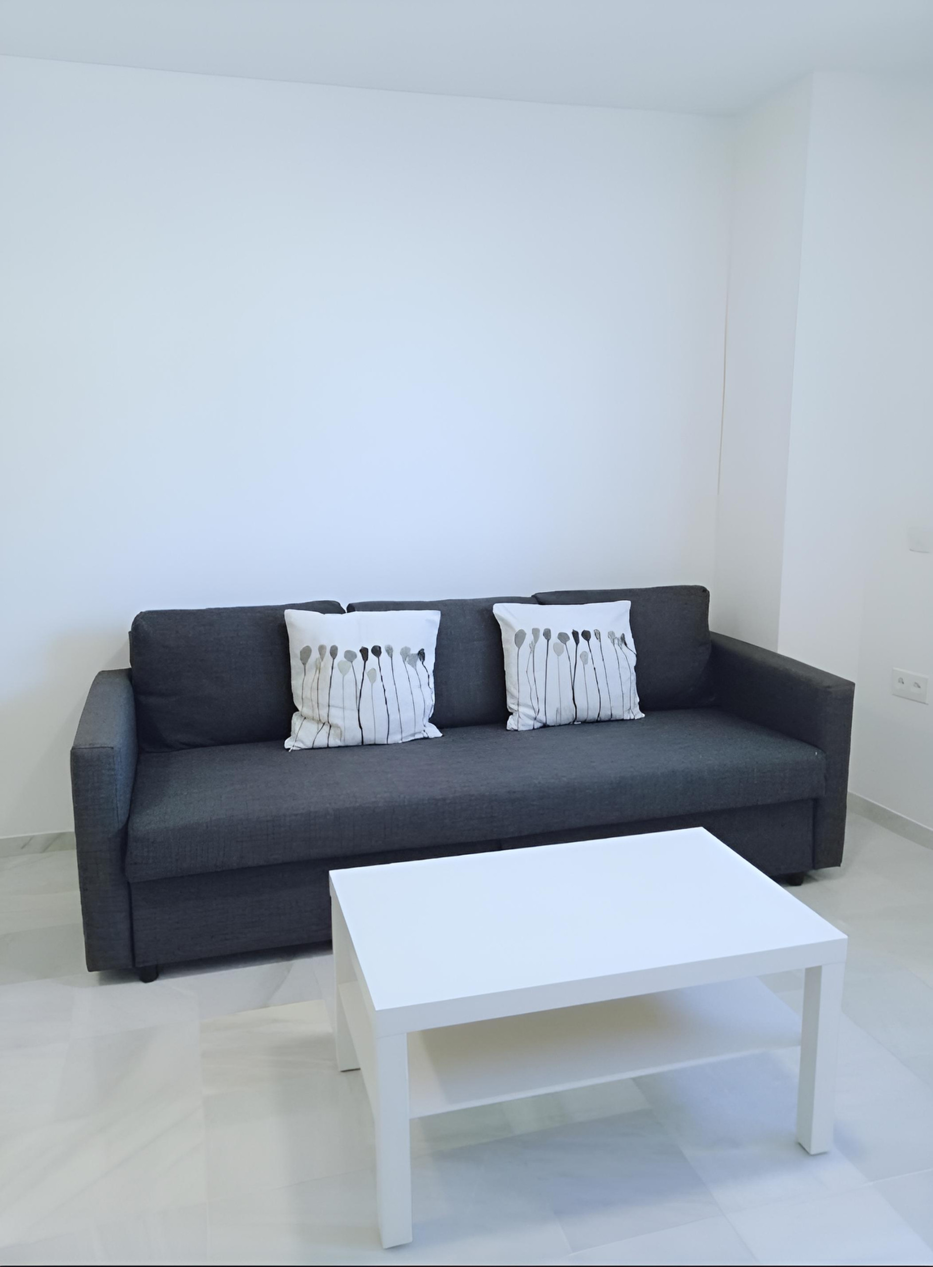 Apartamento recién reformado de un dormitorio, salón amplio con sofá cama, cocina en espacio abierto y un pequeño baño totalmente equipado -