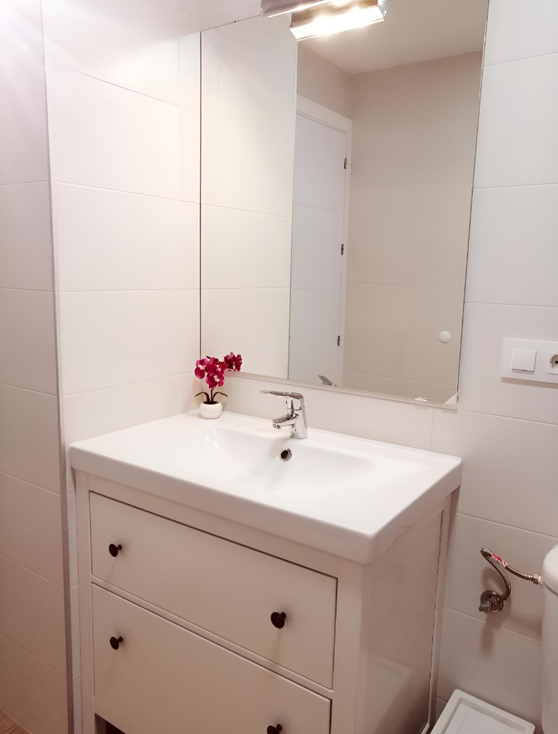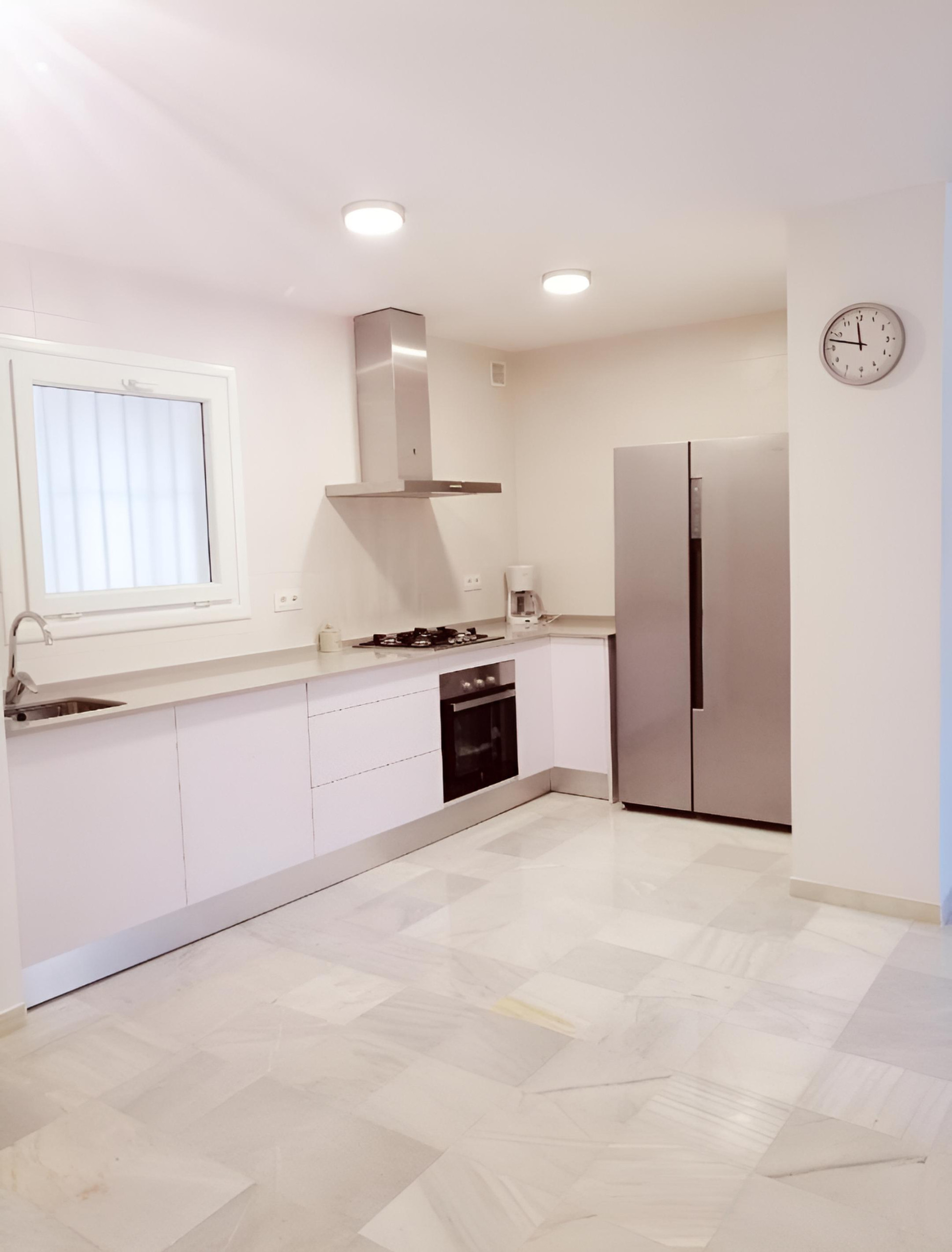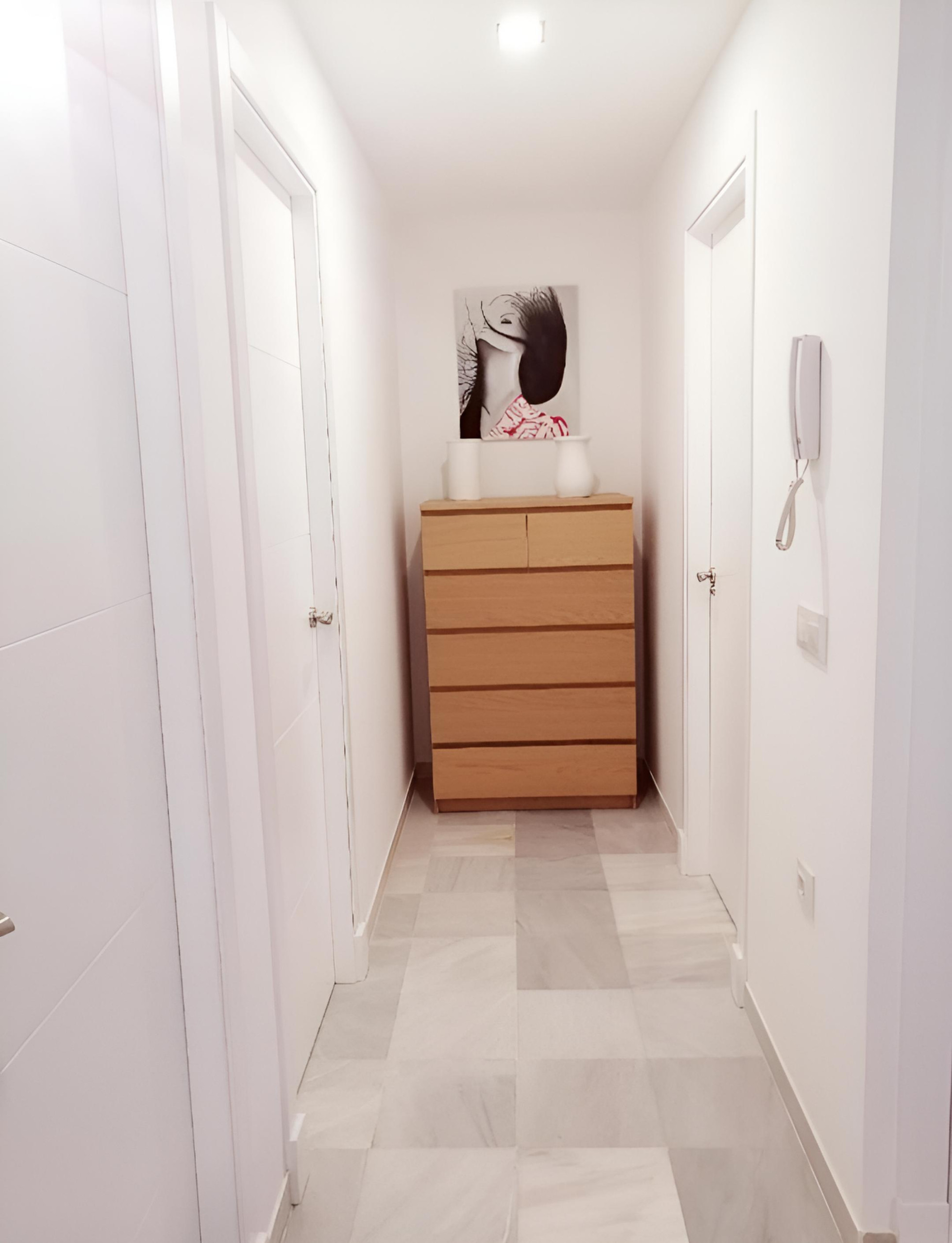 Apartamento recién reformado de un dormitorio, salón amplio con sofá cama, cocina en espacio abierto y un pequeño baño totalmente equipado -