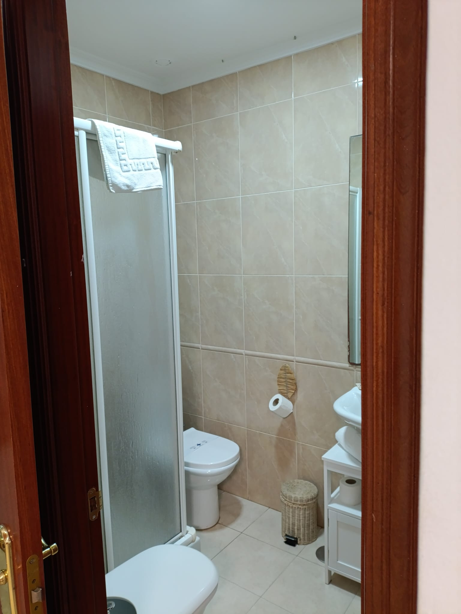 El baño privado con ducha completa las comodidades de este acogedor alojamiento, ideal para disfrutar de unos días de descanso en pareja en el corazón de Cádiz.