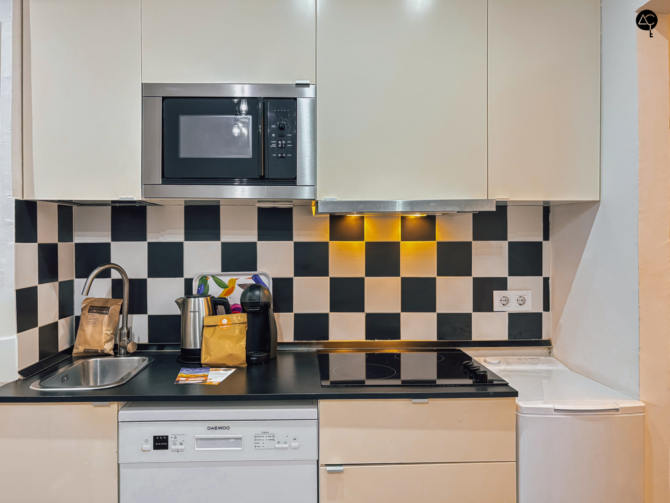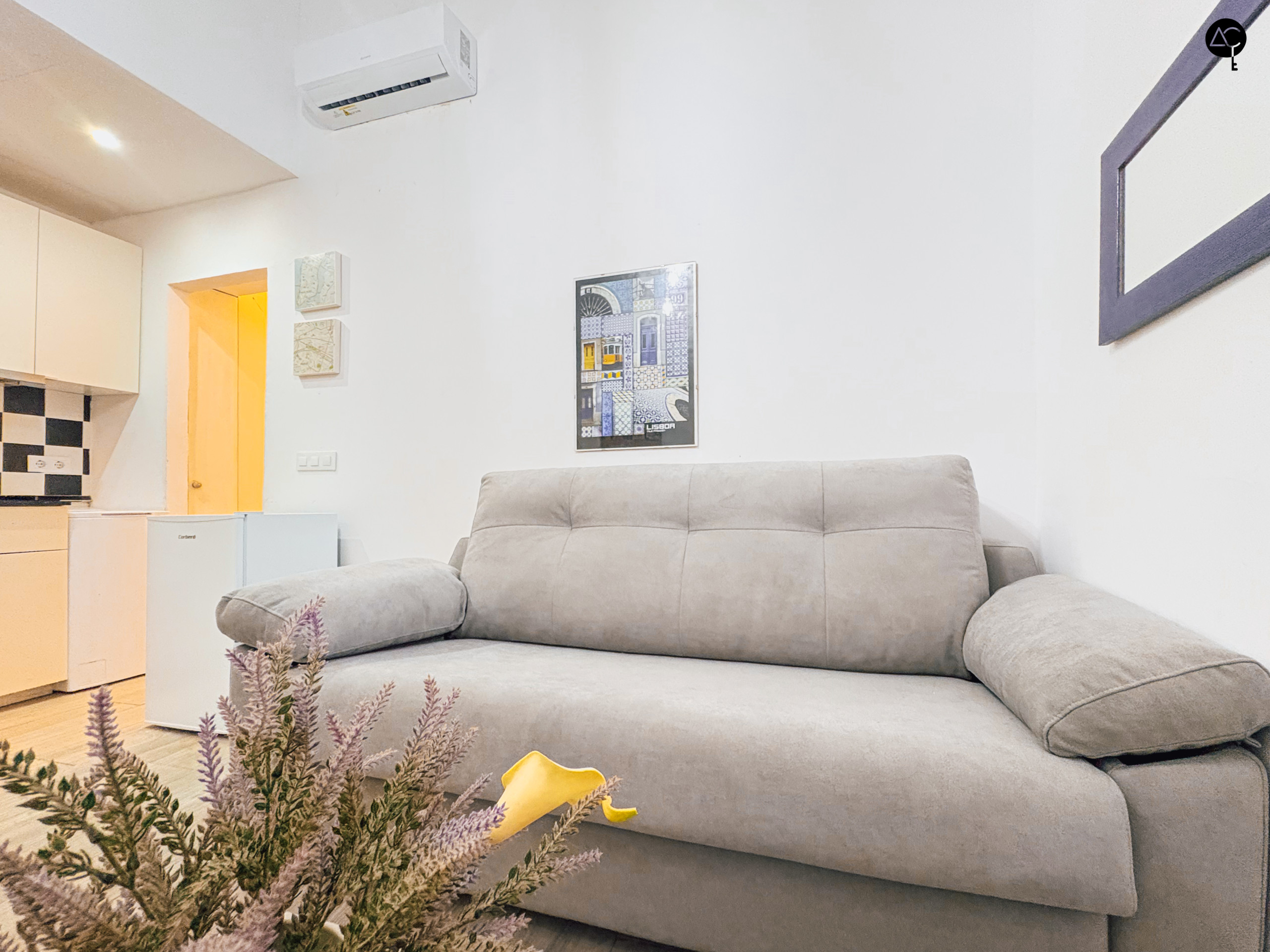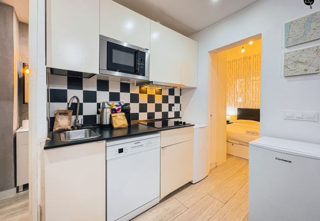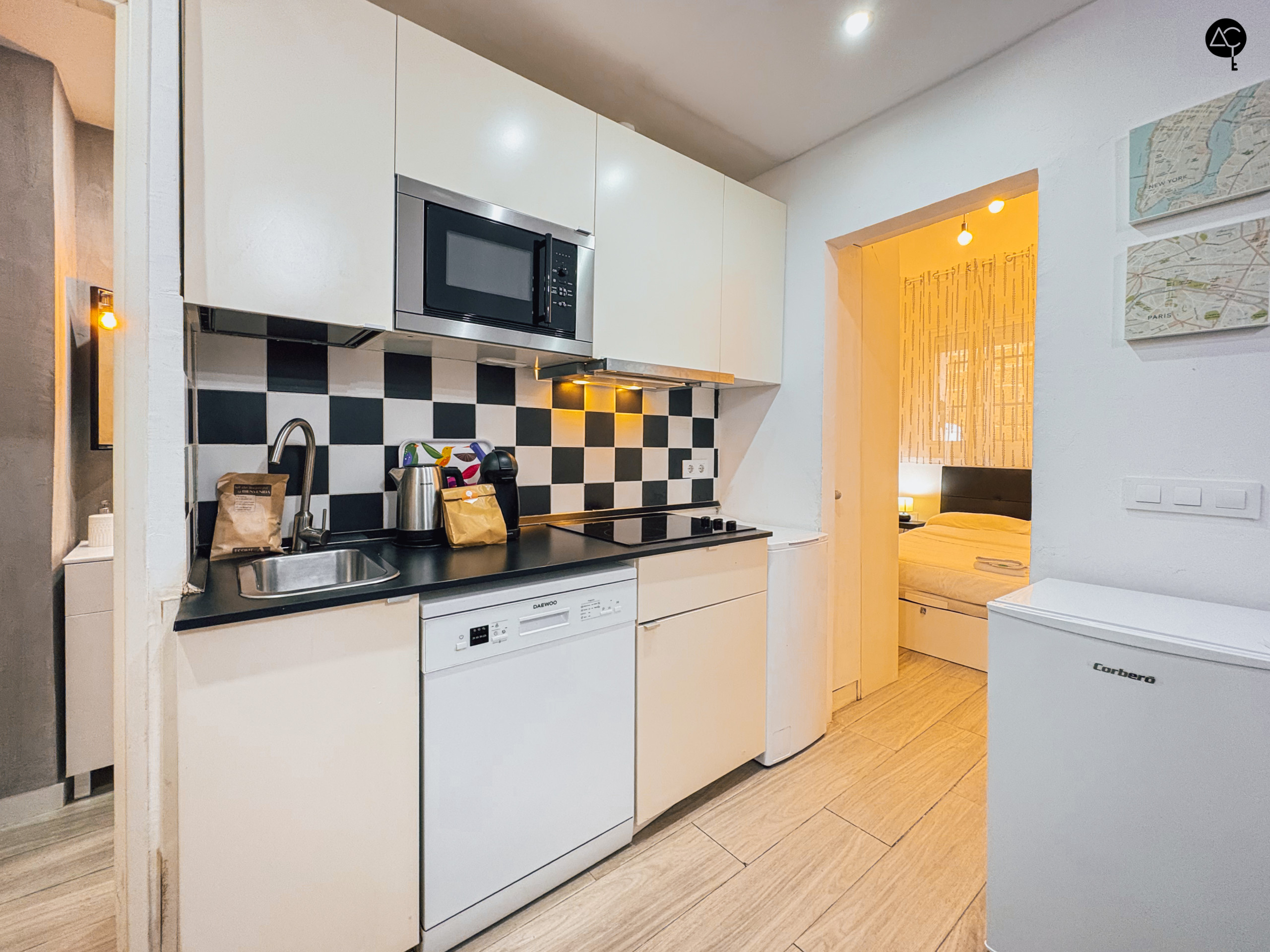 El apartamento cuenta con una habitación principal equipada con una cama doble, ideal para descansar después de un día explorando la ciudad. La cocina americana está completamente equipada con electrodomésticos modernos como nevera, lavadora, lavavajillas, microondas, tostadora, cafetera y hervidor, permitiéndote preparar deliciosas comidas y disfrutar de momentos íntimos.