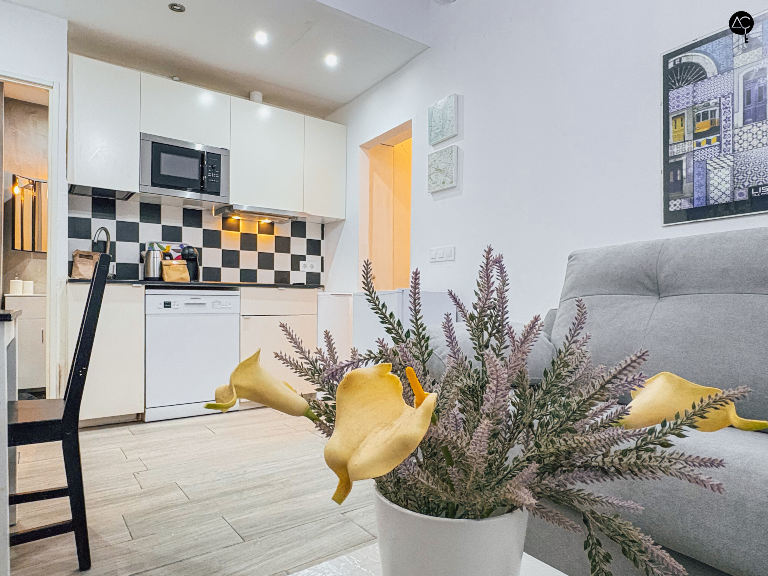 El apartamento cuenta con una distribución en una sola planta y está totalmente equipado para garantizar una estancia cómoda. Dispone de una cocina independiente con electrodomésticos modernos, como nevera, congelador, cafetera y microondas, donde podrás preparar tus comidas. La habitación principal cuenta con una cama doble y armario, y el baño privado tiene ducha.