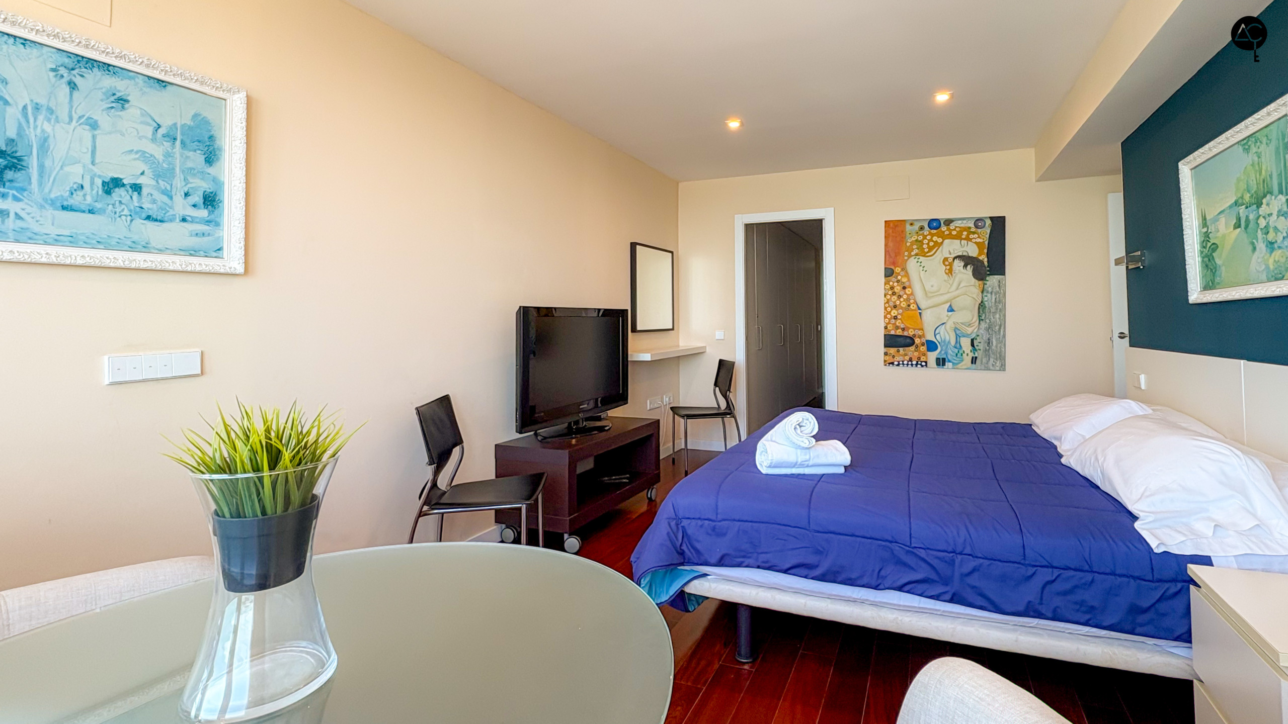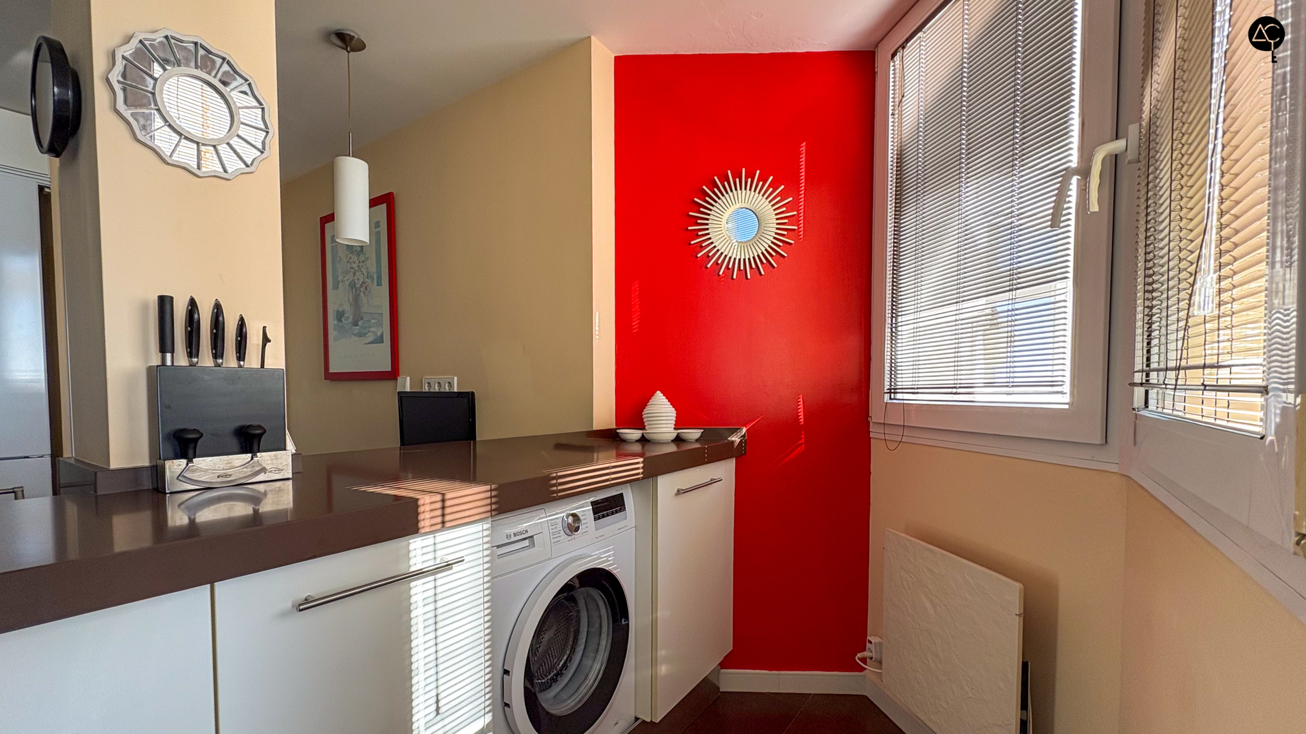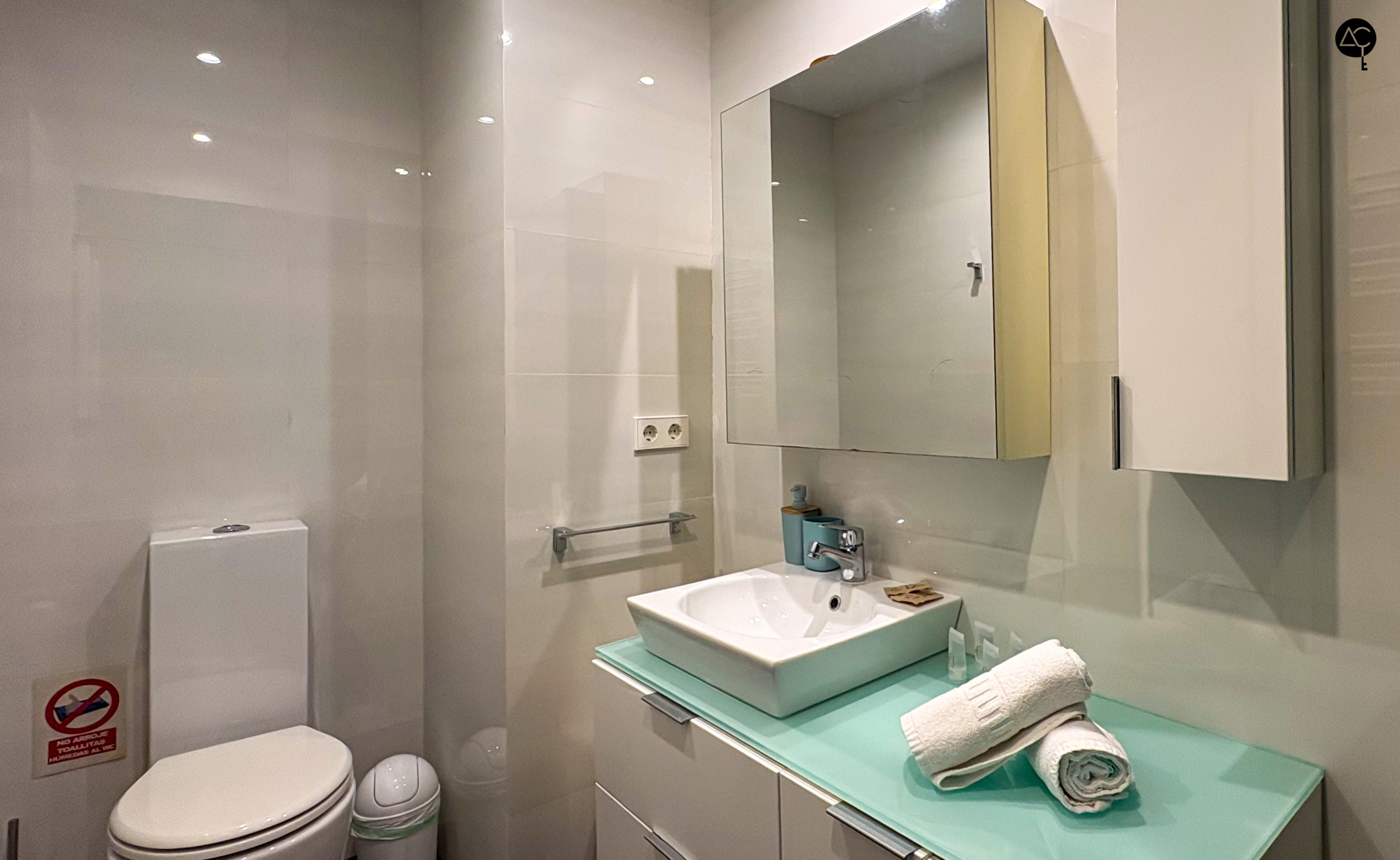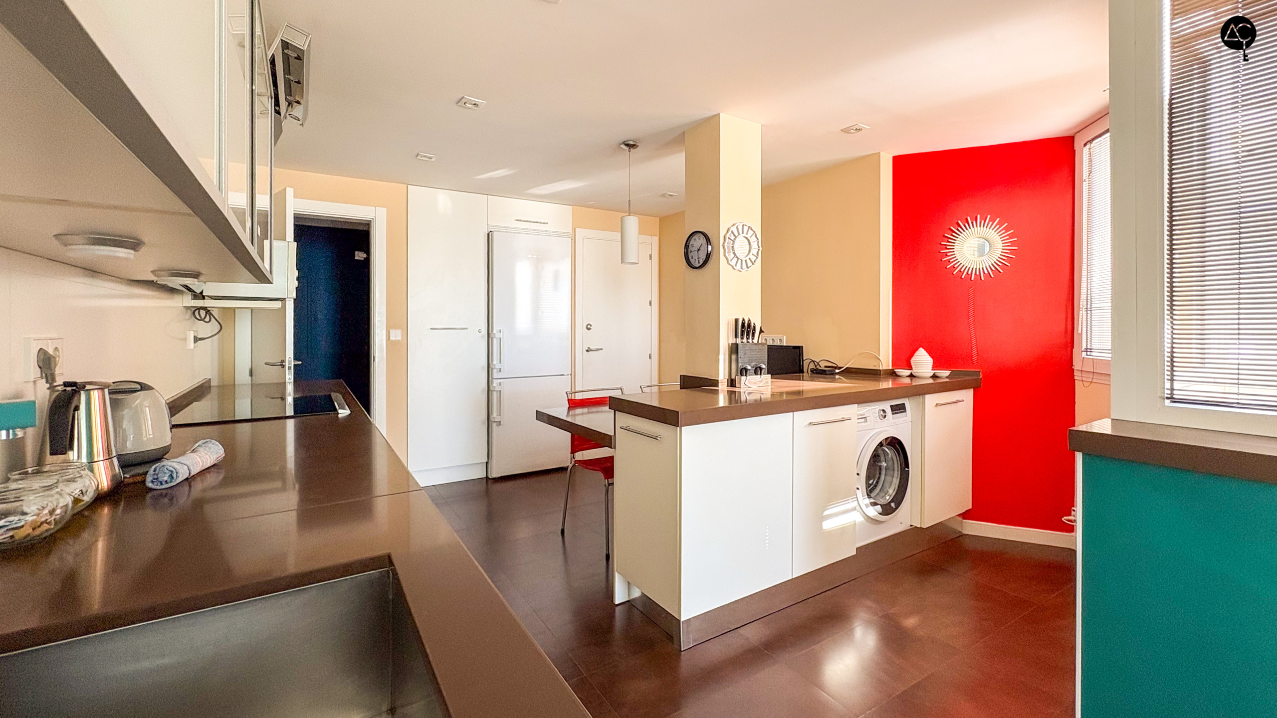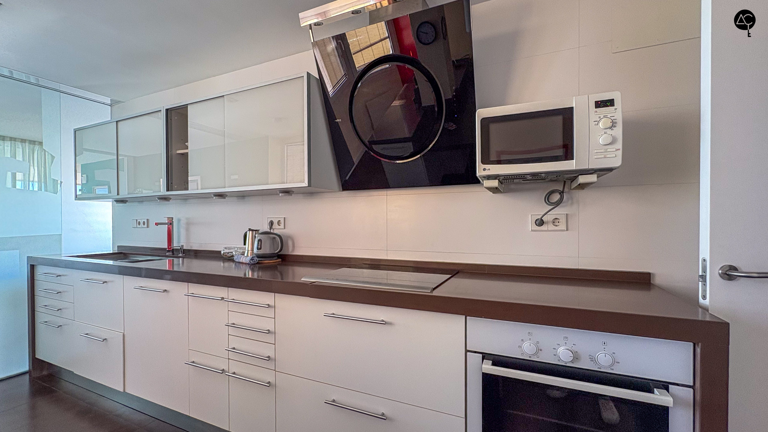 El apartamento cuenta con una práctica cocina independiente equipada con nevera, congelador, lavadora, cafetera, microondas y todos los utensilios necesarios para preparar cómodamente tus comidas. Además, dispone de aire acondicionado para que puedas disfrutar de una estancia fresca y agradable.